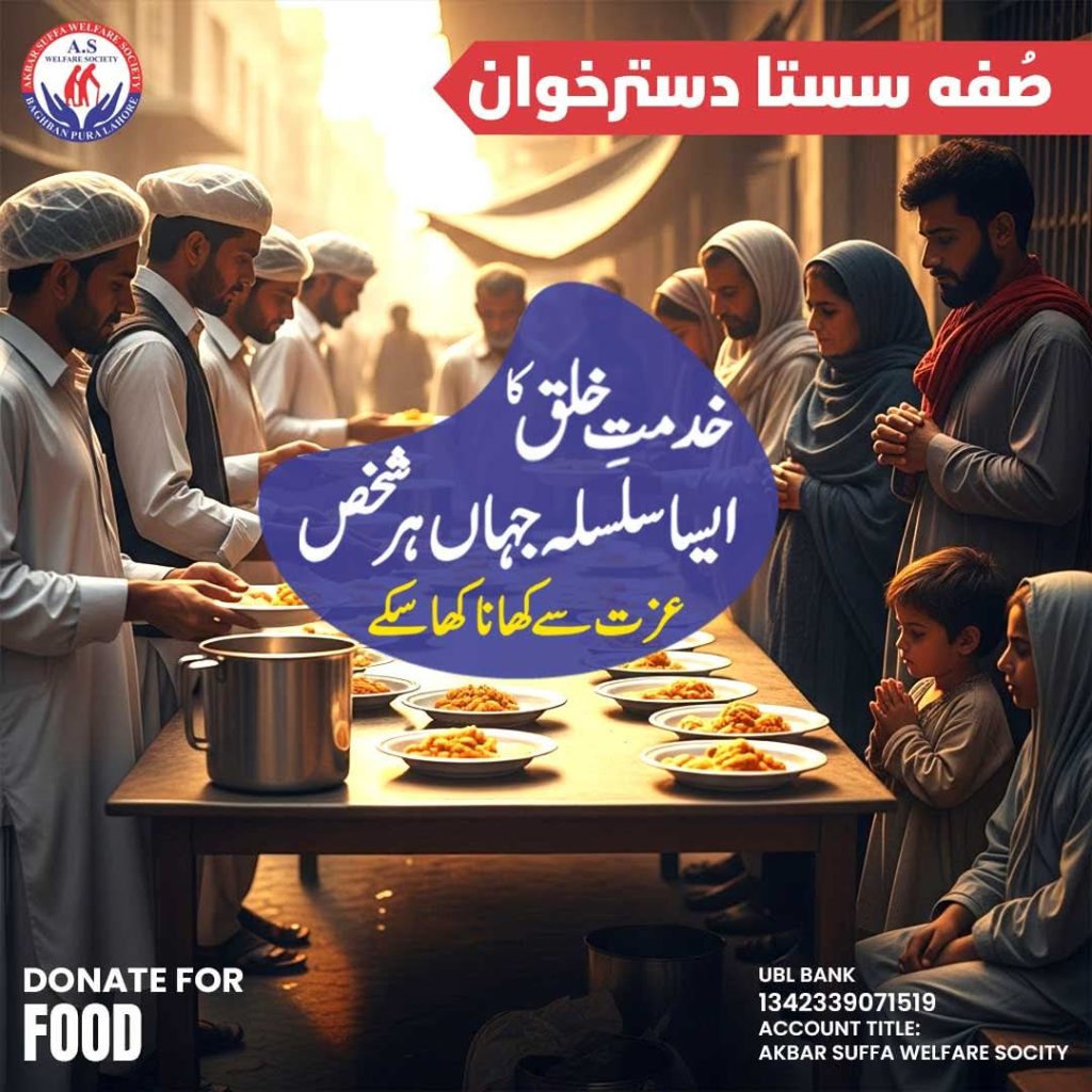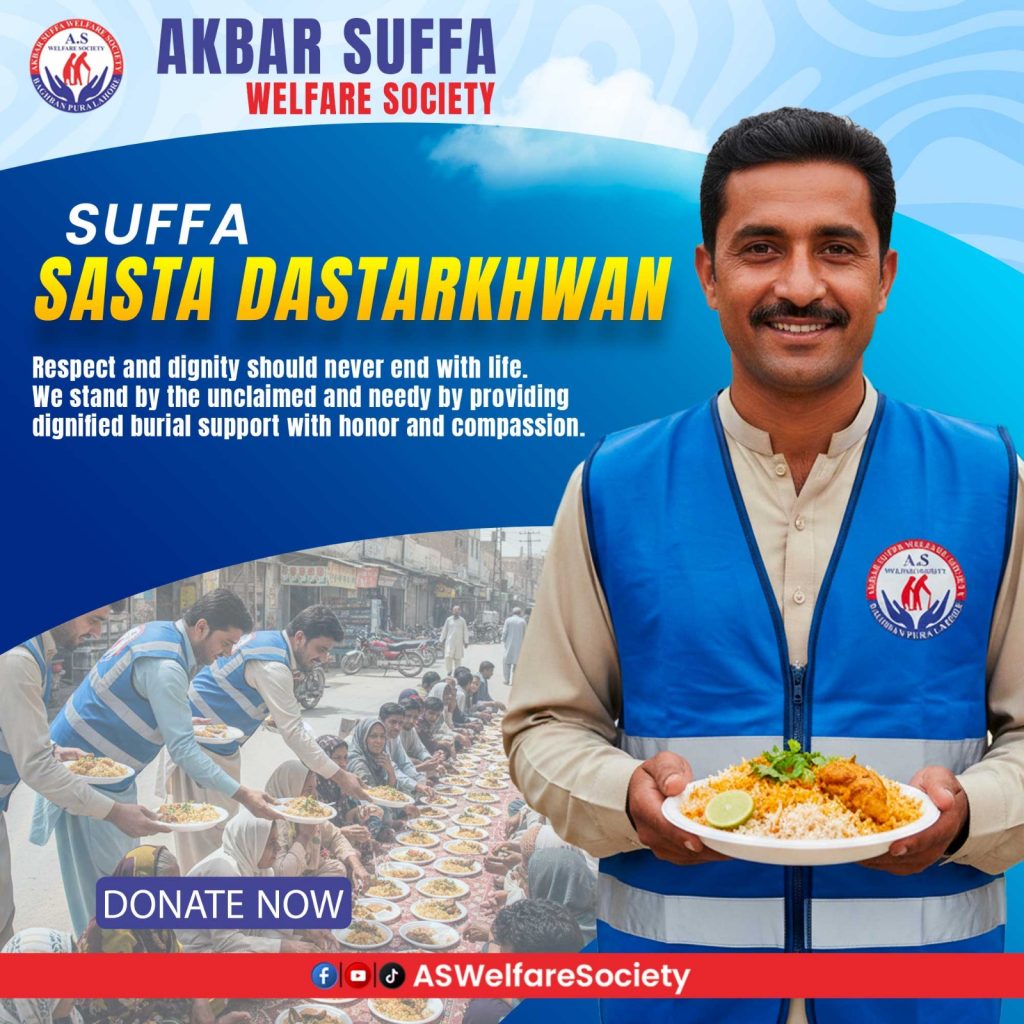 Akbar Suffa Welfare Society operates Suffa Sasta Dastarkhwan as a community-driven initiative dedicated to fighting hunger and food insecurity among underprivileged individuals and families. Through this program, we provide affordable, freshly prepared, and nutritious meals to those who struggle to meet their daily food needs. Our goal is not only to serve food, but to restore hope and dignity by ensuring that every person is treated with respect and kindness.